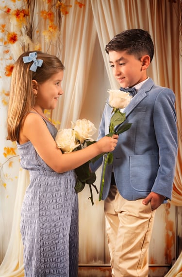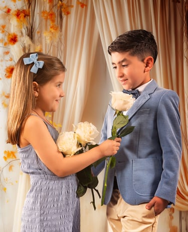 Vestuario personalizado - Incluimos trajes y vestidos exclusivos en la talla exacta de tu niño/a y en el color que elijas, sin costo adicional. Desde diseños clásicos hasta propuestas más modernas, cada prenda está pensada para realzar la belleza natural de tu pequeño.
